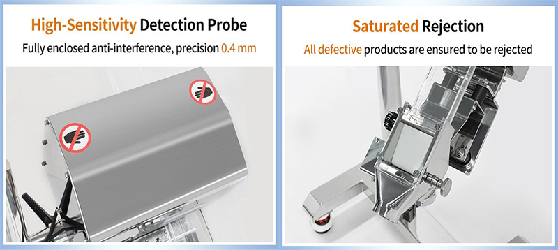5. Rejection System: When a contaminated tablet is detected, the machine automatically rejects the defective product using a rejection mechanism (such as an air jet or pusher), ensuring that only uncontaminated products can proceed.
