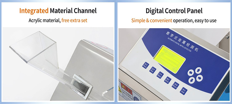 6. Hygienic Design: Constructed of stainless steel with a smooth surface, it meets the stringent hygiene standards of the pharmaceutical industry. This design minimizes the risk of contamination and ensures ease of cleaning. 7. Compact Size: Pill metal detectors are typically compact and can be easily integrated into small production spaces without major modifications.