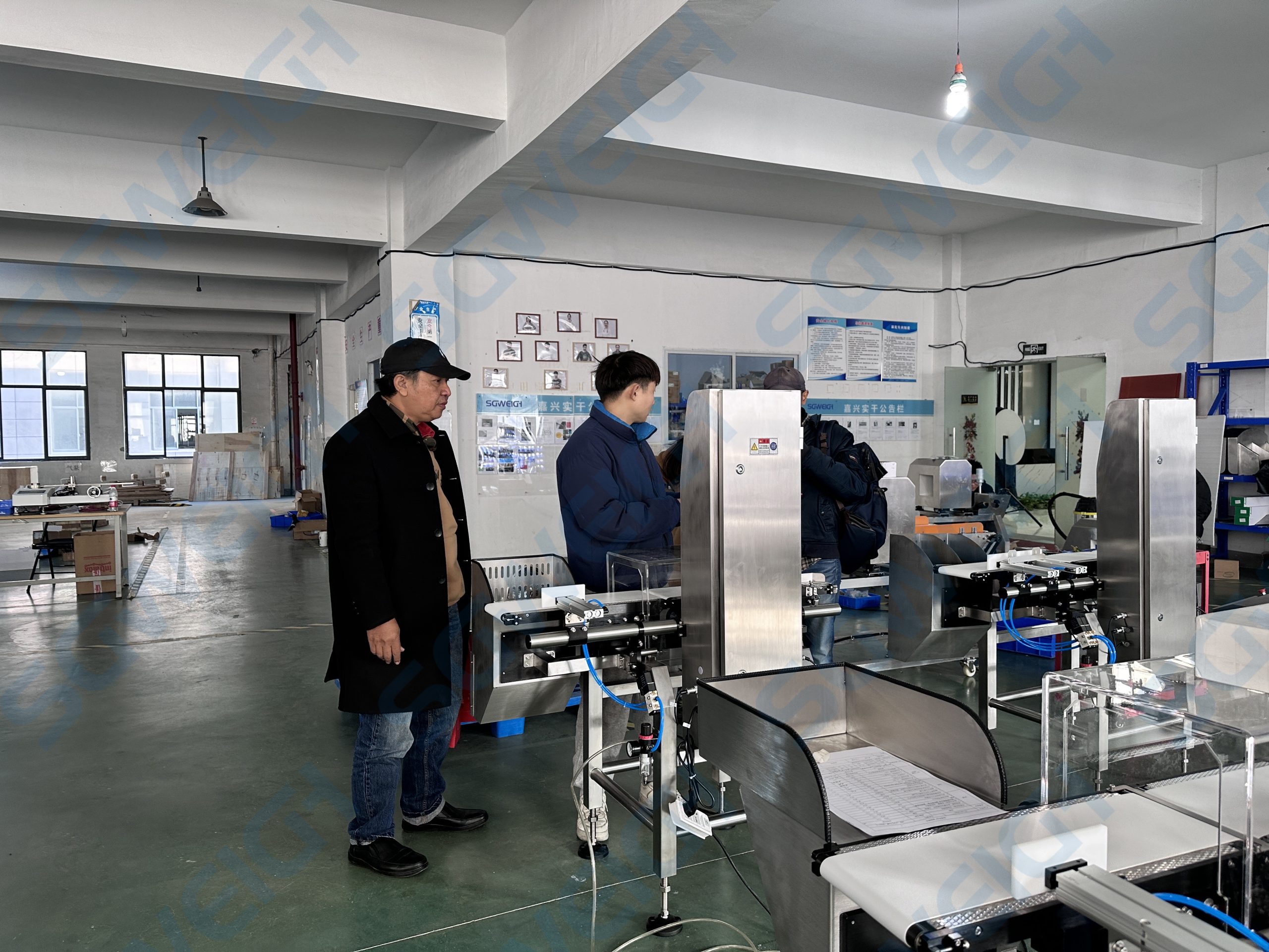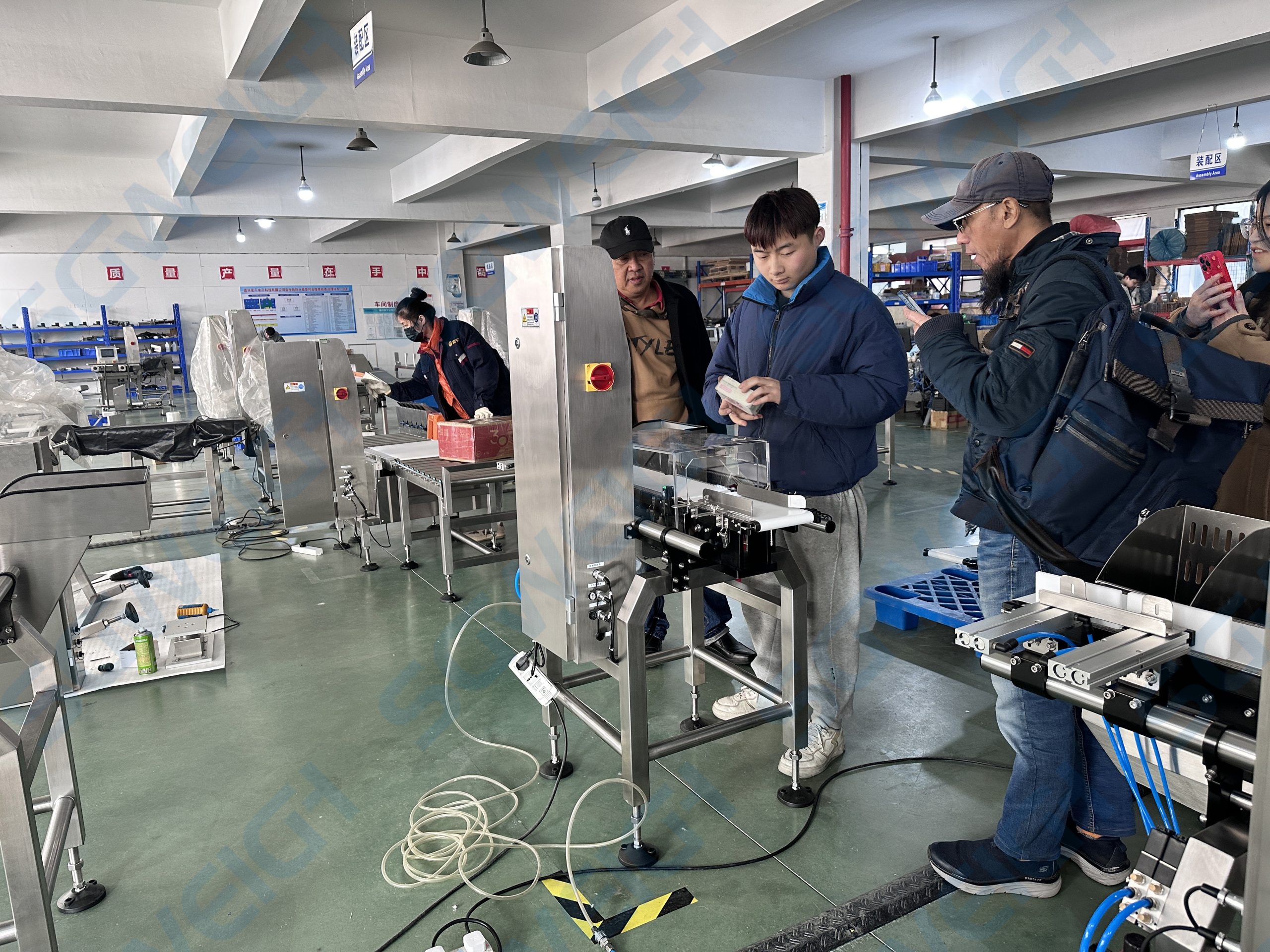 Recently, Indonesian customers came to Shanghai for a practical visit and came to our factory in Jiaxing City, Zhejiang Province. We warmly received them. During the period, customers visited the checkweigher machine and digital metal detector production lines, learned more about the new products, and discussed and exchanged technical problems with technicians.